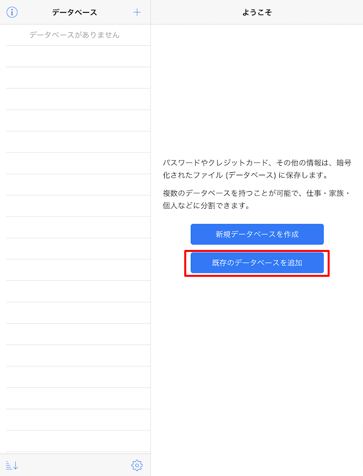 KeePassiumを起動して、「既存のデータベースを追加」をタップします。