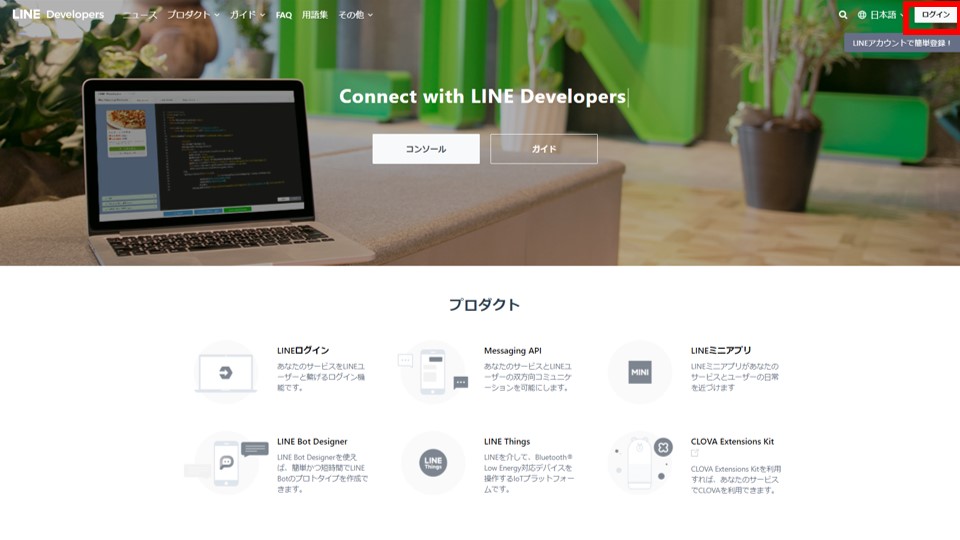 まず、LINE Developersのサイトへアクセスします。