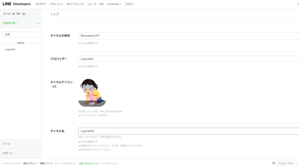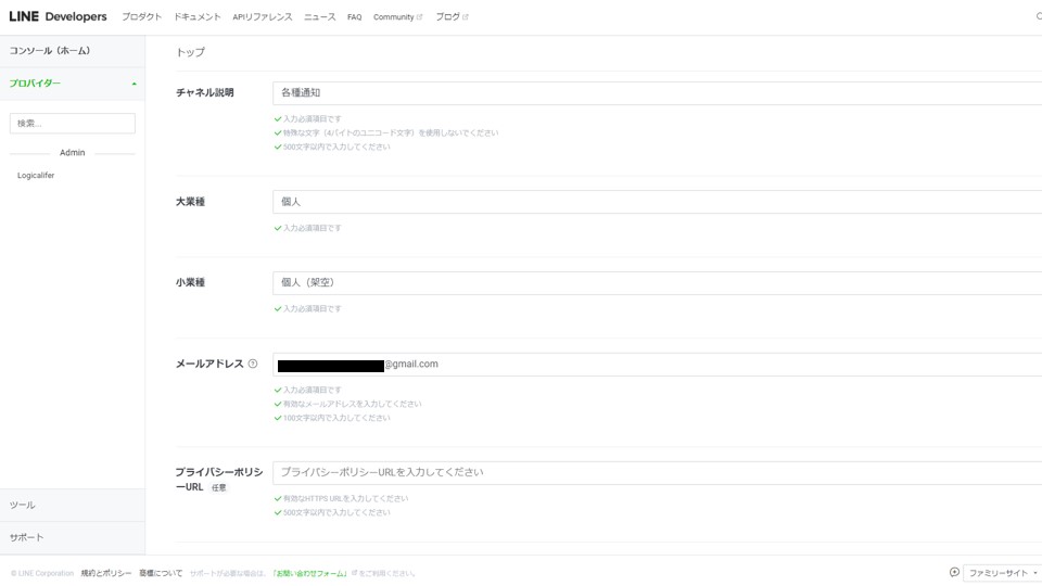 ここまでで、LINE Developerの登録が完了しました。