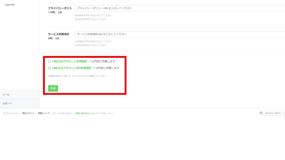 プライバシーポリシーURL、サービス利用規約URLは任意のため空欄で良いです。規約に同意して作成します。