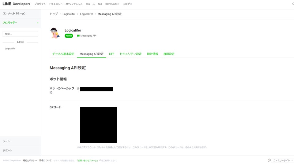 チャンネルが作成されるので、Messaging API設定をクリックします。QRコードが表示されるので、友達登録します。
