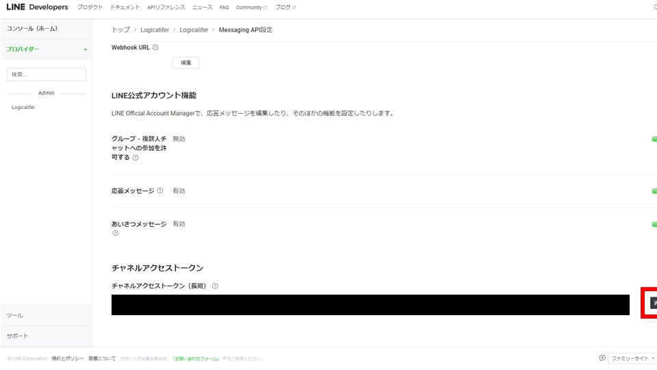 下のほうにある、チャネルアクセストークンを発行します。表示されたチャネルアクセストークンはメモ帳等で控えます。