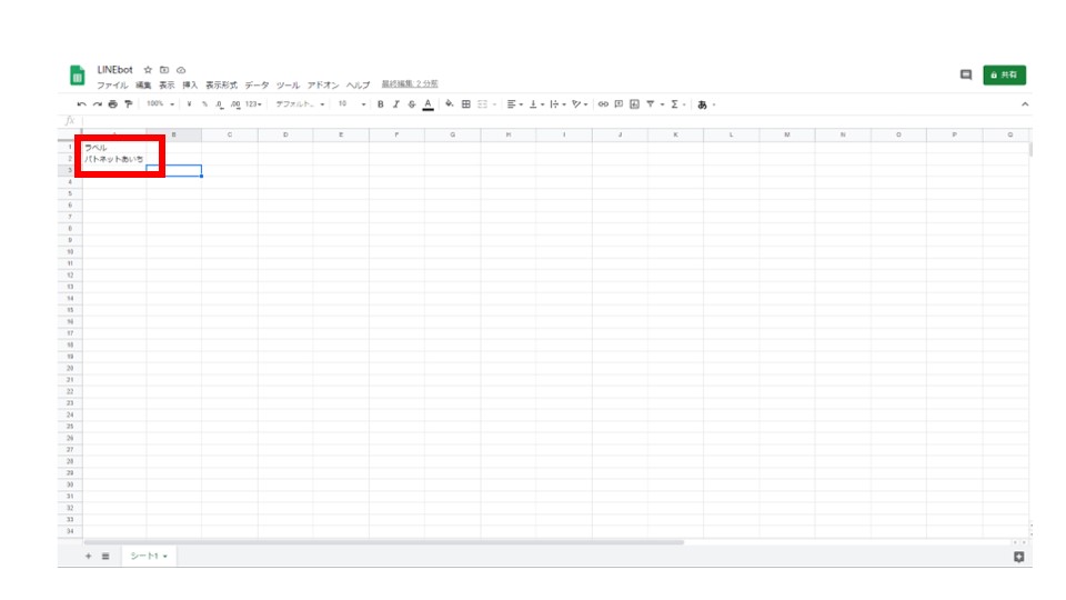 パトネットあいちのメールを登録しているGmailアカウントで、Googleスプレッドシートを開きます。A1セルにラベル、A2セルにGmailに登録するラベル名を記入します。A2セルで記入したラベル名は、使用するGmailで実際に使用しているものにしてください。また、テストするために、このラベルが割り付けられたメールをいくつか未読にしておいてください。