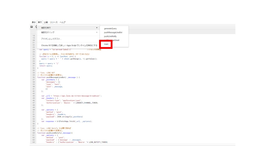 保存したら、実行>関数を実行>mainを実行します。このとき、Googleのセキュリティのダイアログが出てきますが、自分でしていることですので、気にせずに認証を与えて続行していきます。