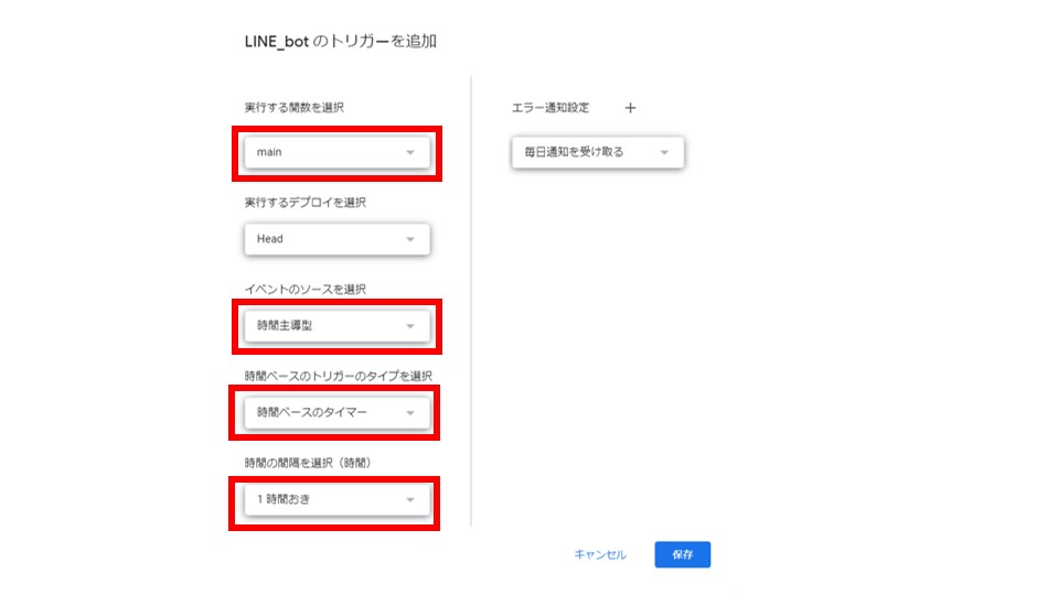 実行する関数をmainに、イベントのソースを時間主導型に、時間ベースのトリガーのタイプを時間ベースのタイマーに変更します。時間の感覚を任意のもの(私は1時間にしました)に変更し、保存します。