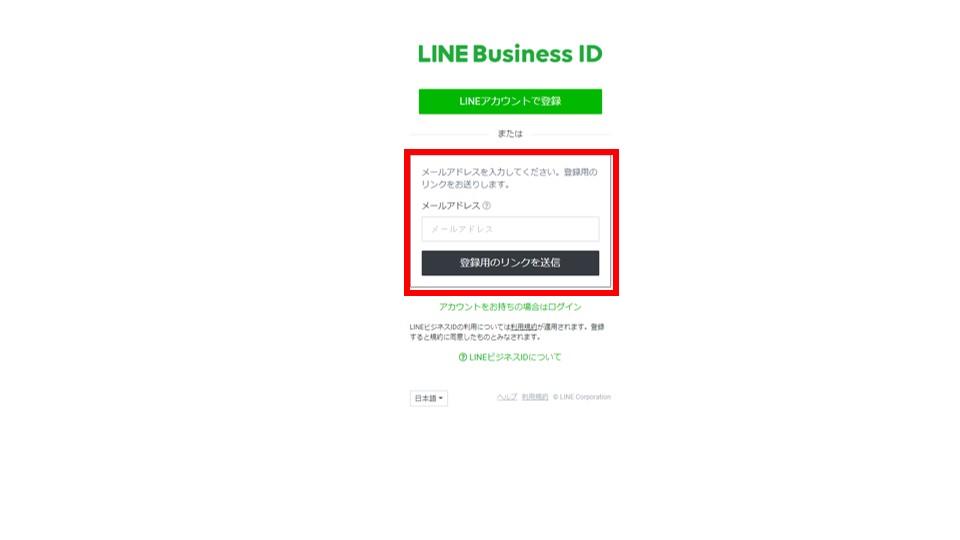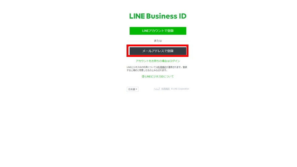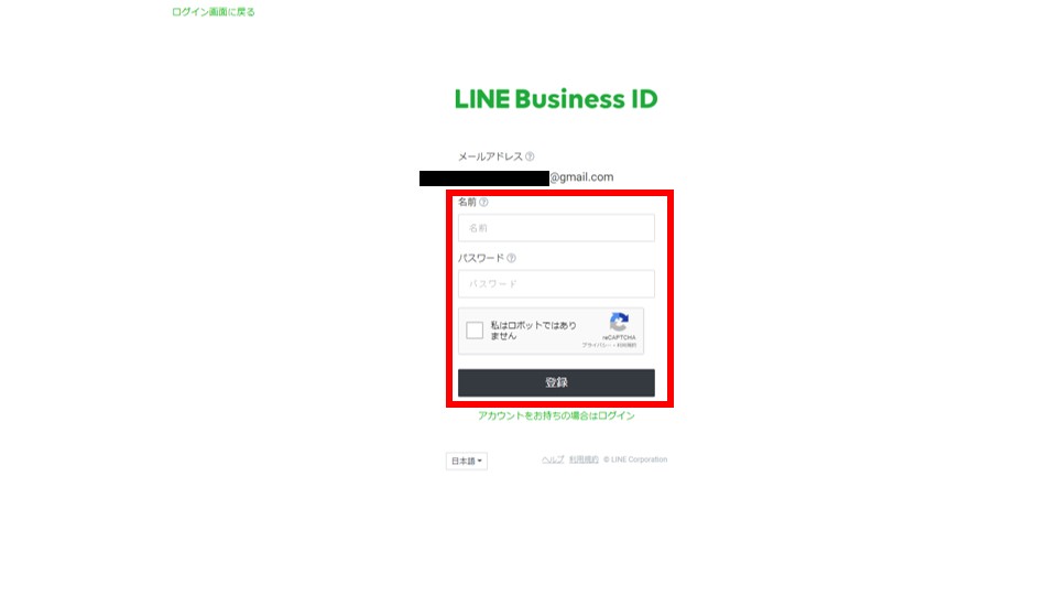 入力したメールアドレスを確認すると、LINEからメールが送られてきているので、クリックします。この画面で、LINE Business IDで使用する名前とパスワードを登録します。