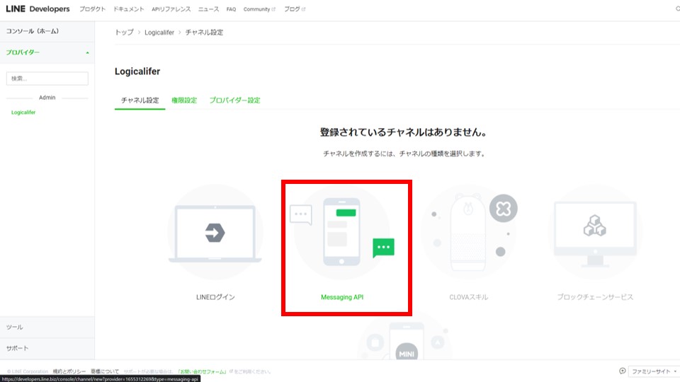 チャンネル設定の画面になるので、Messaging APIをクリックします。