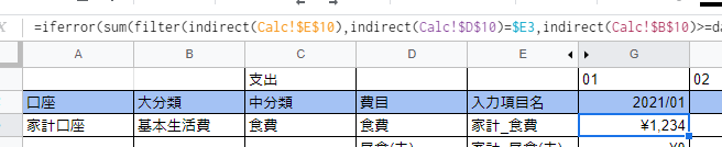 2021年01月の家計_食費は下記の関数で集計しています。