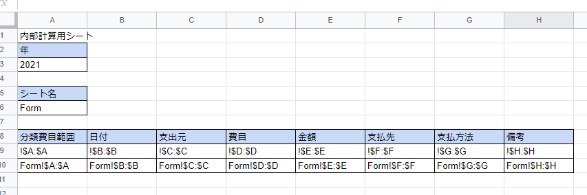 - A10~H10:A6セルとA9~H10と組み合わせた値です。例えばA10セルは「=$A$6&A9」として、Form!A$:$Aを表しています。