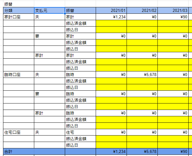 これで、家計簿としての支出のデータ化と、支払った金額を家計から個人の口座へ振り込むためのデータ作りができました。