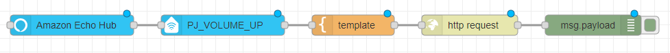 次にAmazon echo deviceノードです。設置後ダブルクリックし、名前を「PJ_VOLUME_UP」に変更し、topicを18に変更します。(名前は何でも良いです。後で、ボリュームアップすることが分かる名前であればOKです)