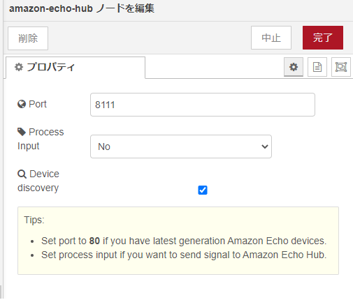 最初はAmazon eho hubノードです。設置後ダブルクリックし、ポートを8111に変更します。