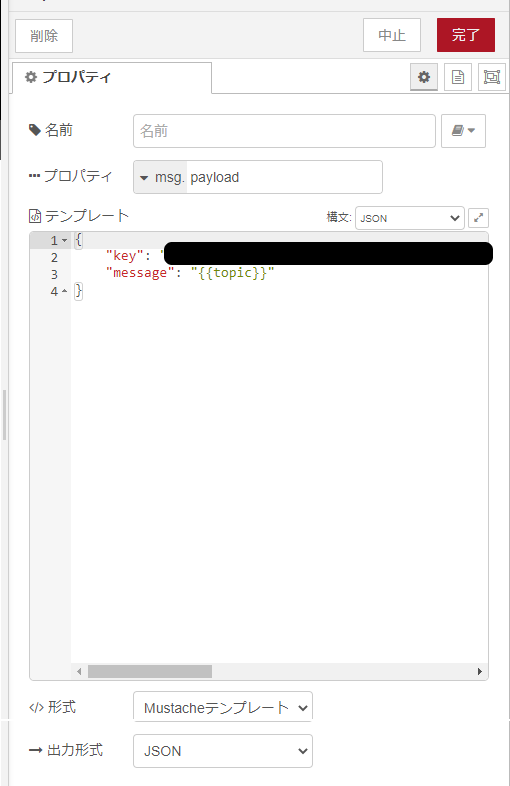 次にtemplateノードです。設置後ダブルクリックし、一番下の出力形式をJSONに変更後、入力欄に下記を入力します。