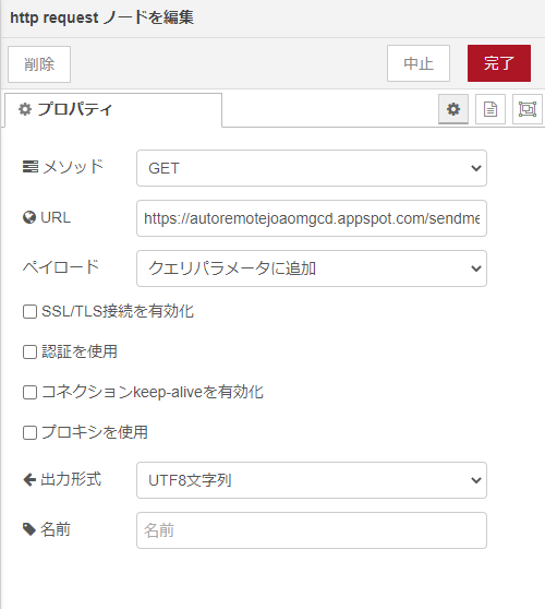 次にHTTP Requestノードです。メソッドはGET、URLは先程のAutoRemoteのテストで開いていたブラウザの送信ボタンの下にあったコードのうち、keyより前の部分になります。