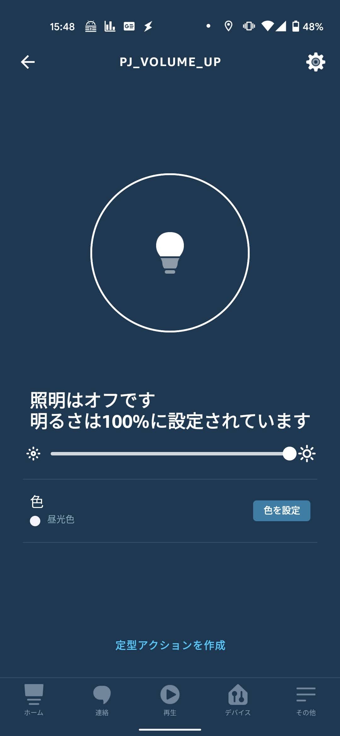 デバイスの照明から「PJ_VOLUME_UP」を選択し、ライトをタップして照明をつける操作を行います。