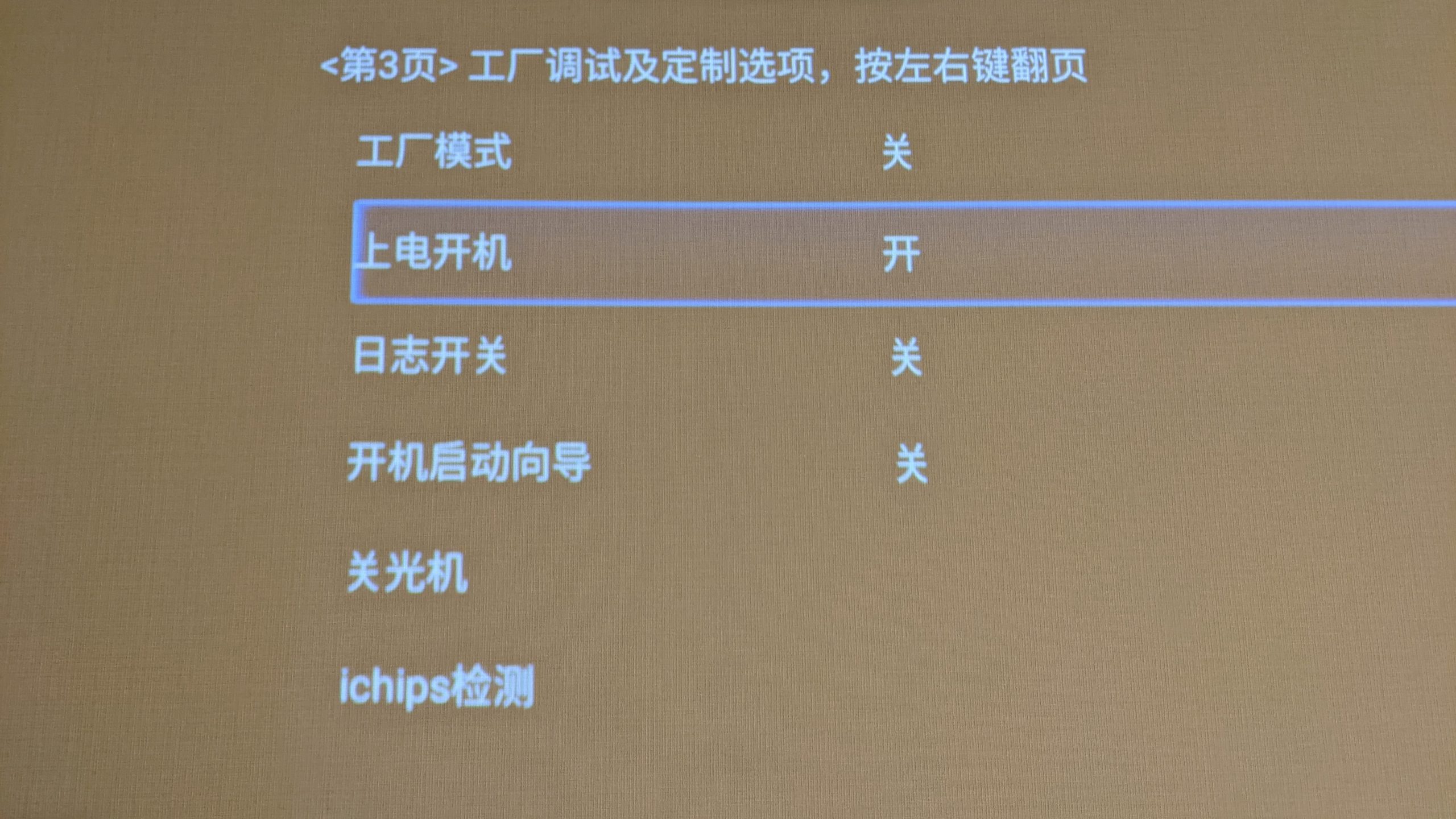 BIOS画面を開き、リモコンで3ページ目に移り、上から2番目の「上电~」の値を「开」に変更します。