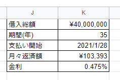 今回は例として、下記の条件で作成しようと思います。なお、金利は2021年1月時点の三菱UFJ銀行の変動金利の値を採用しています。
