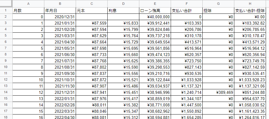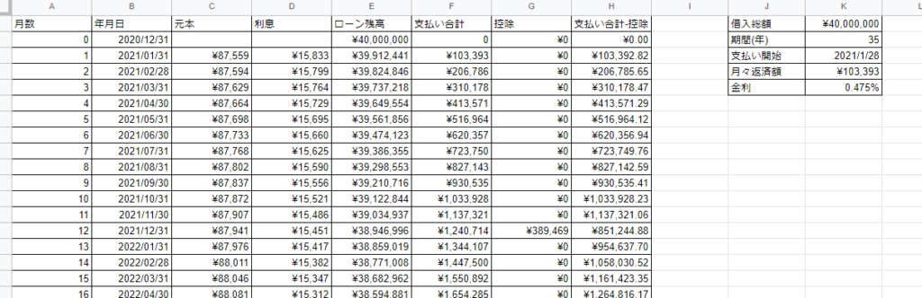 なお、念の為C列とD列の合計が月々の返済額と一致しているかを確認してくださいね。