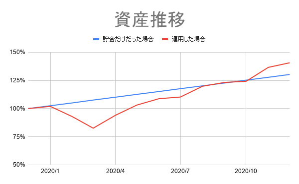もし、投資に回したお金を投資せずに貯金だけしていた場合は、資産額は2020年1月に比べて30%UPでしたが、投資をしたおかげで40%UPで着地することができました。